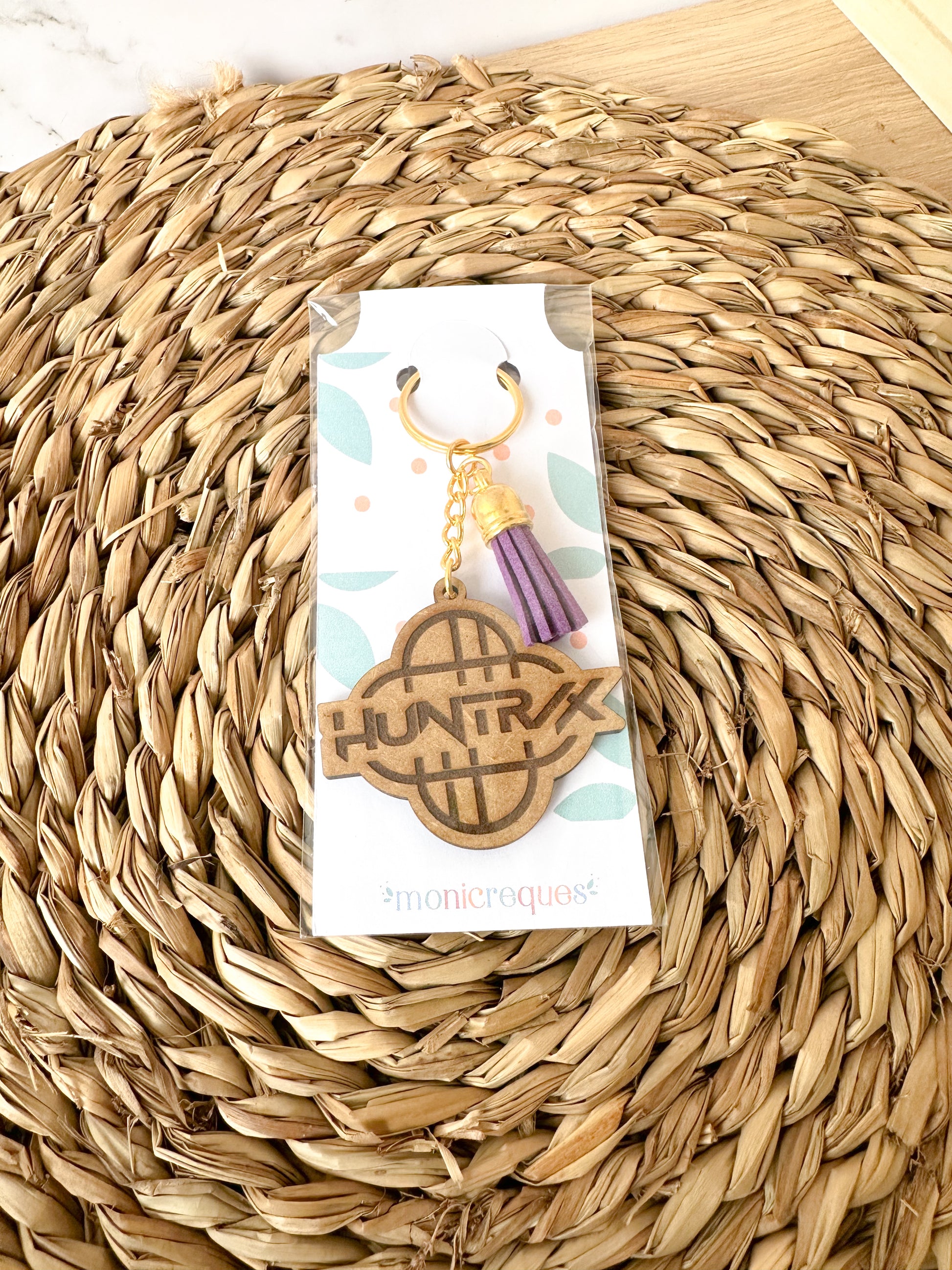 🔑 Llavero de madera grabado con el logo Huntrix con borla morada