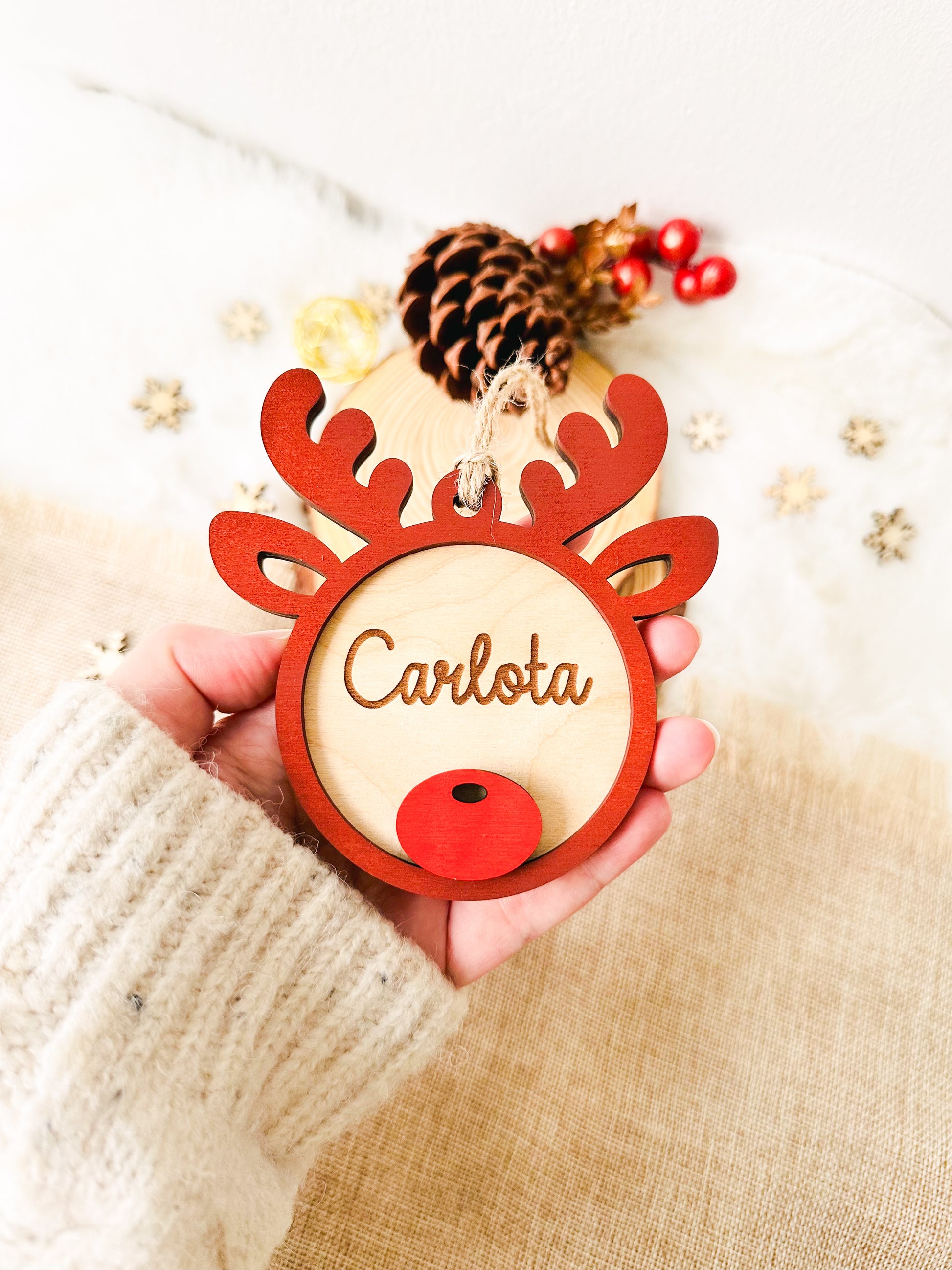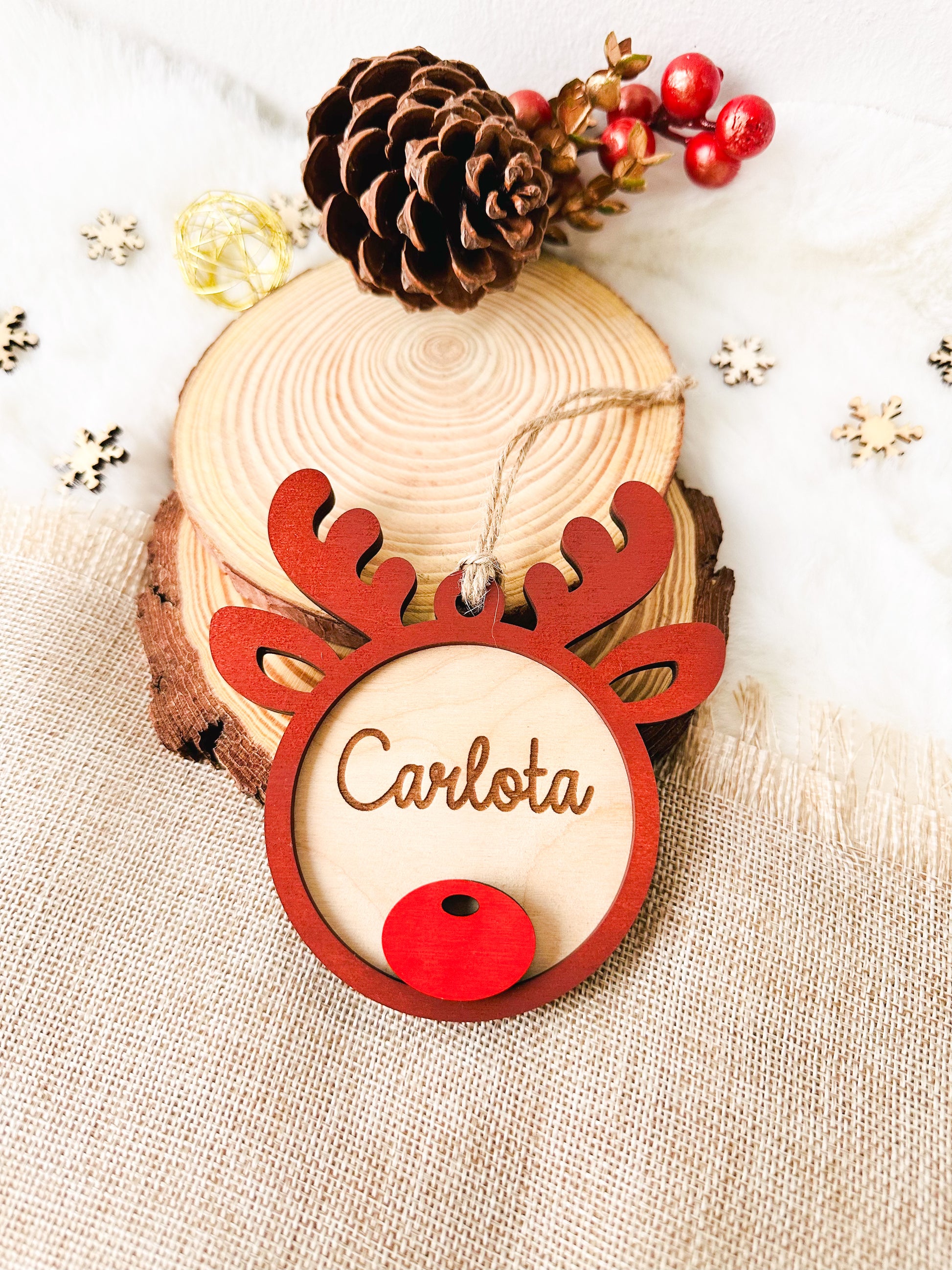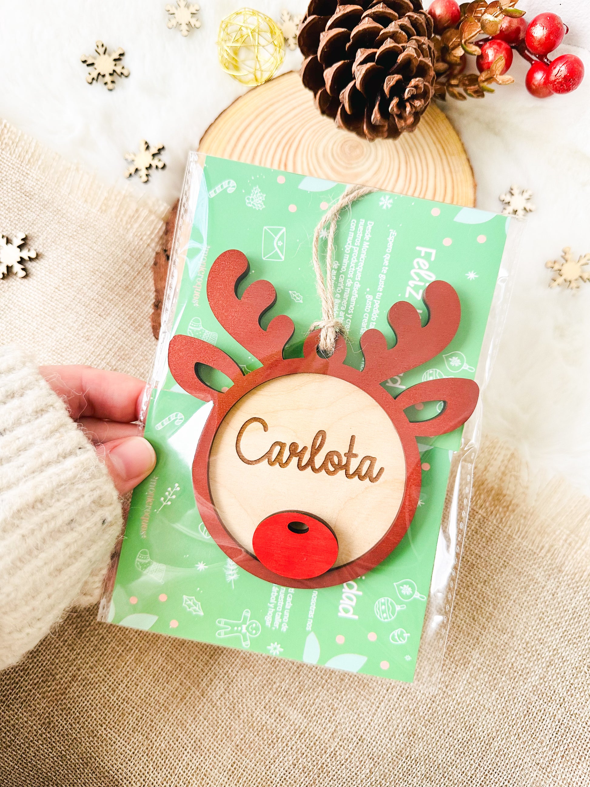 Este adorno de reno en madera de abedul se personaliza con el nombre que tú elijas, grabado a láser para un acabado limpio y elegante.