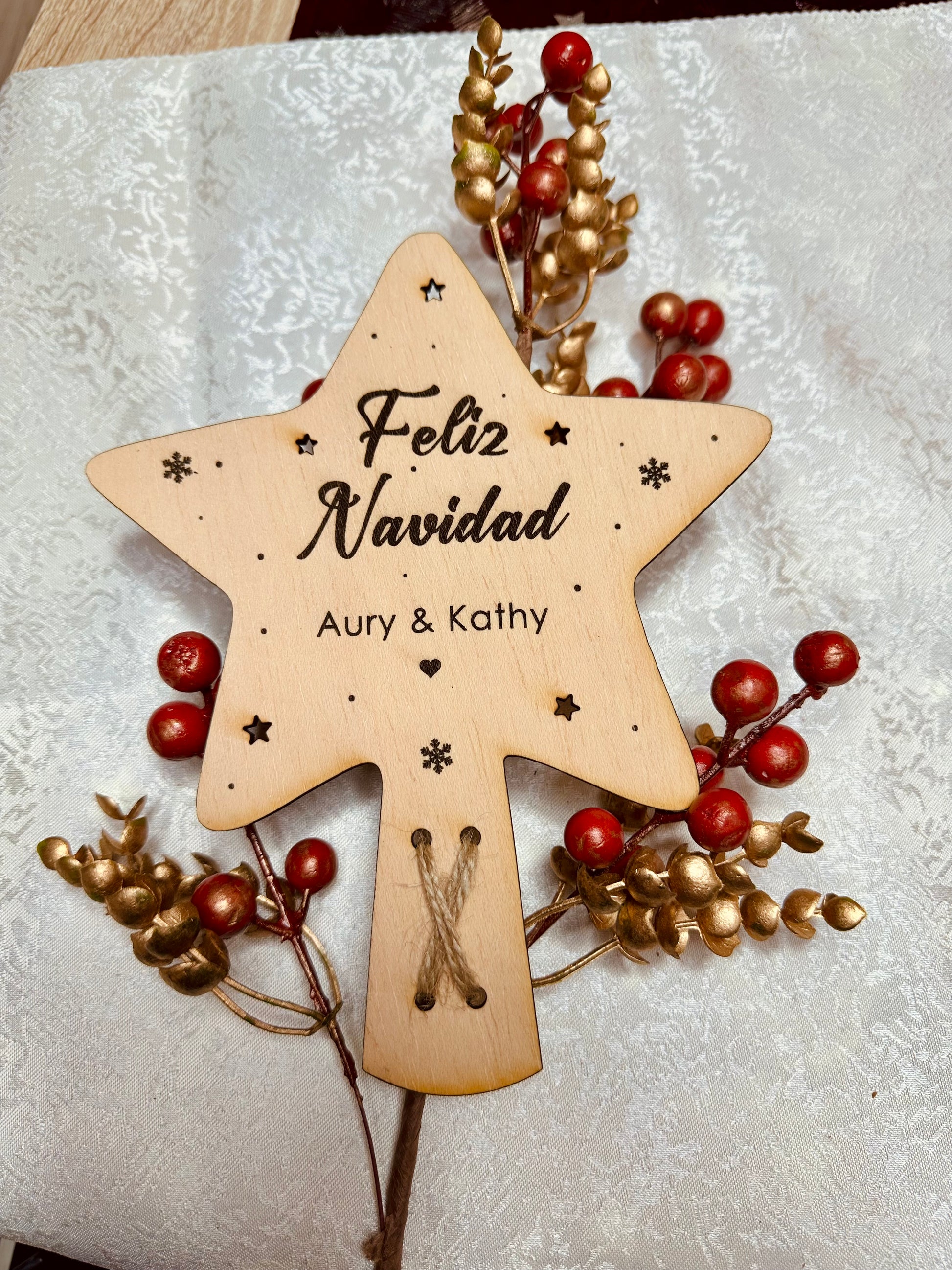 Llena tu árbol de magia y personalidad con nuestra estrella de Navidad personalizada, grabada a láser con los apellidos de tu familia o los nombres que elijas.