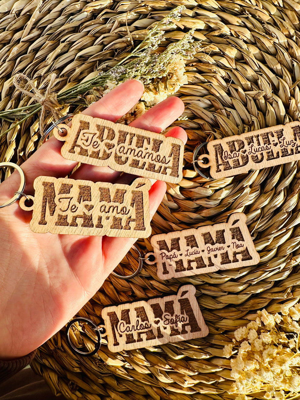 Si lo que quieres es sorprender con un bonito detalle para celebrar uno de los días más especiales, os presentamos nuestros llaveros de madera personalizados. Podrás personalizarse con una frase corta o los nombres de la familia (máximo 4 nombres).