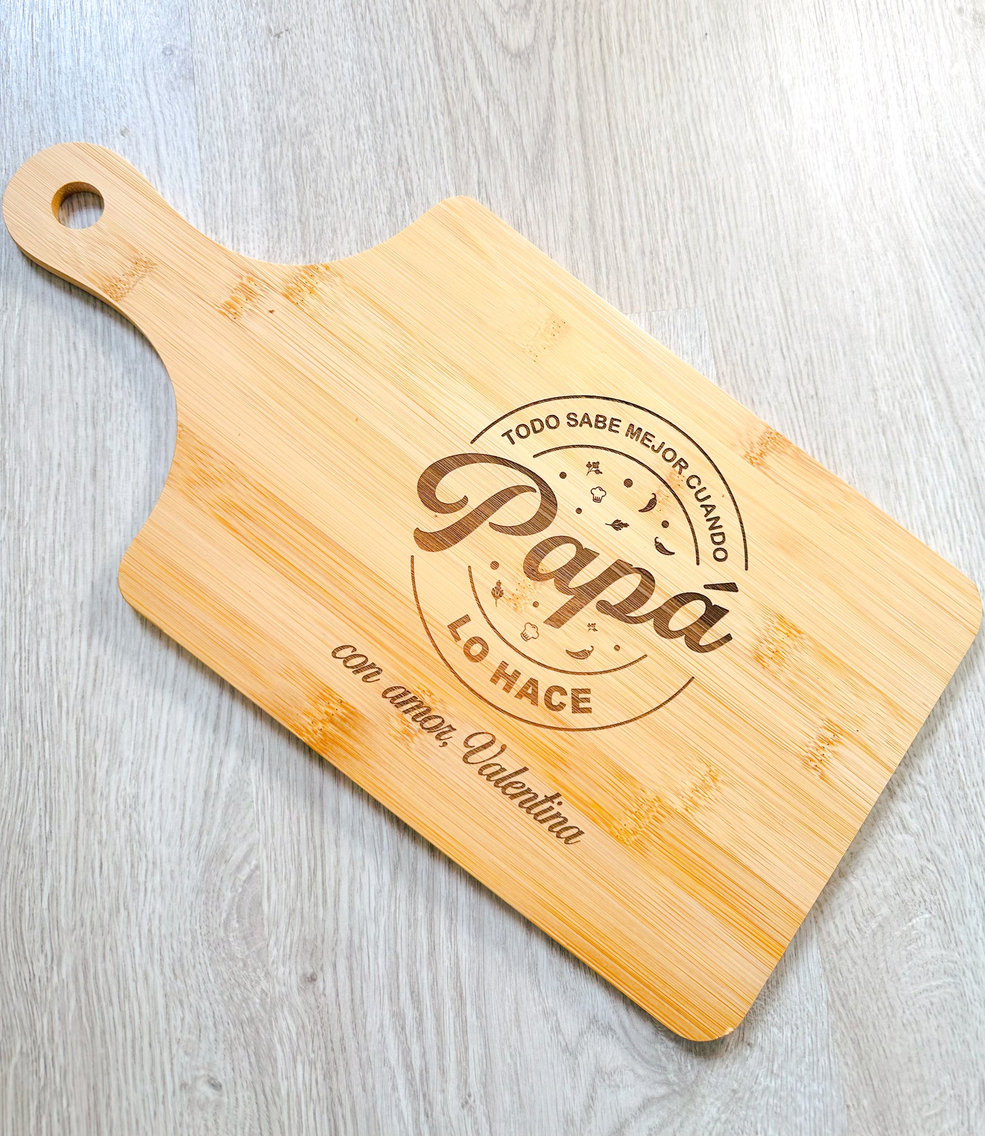 - Tabla de bambú de 39,5cm x 20cm x 0,8cm. Puedes personalizarla con el o los nombres que tu quieras.