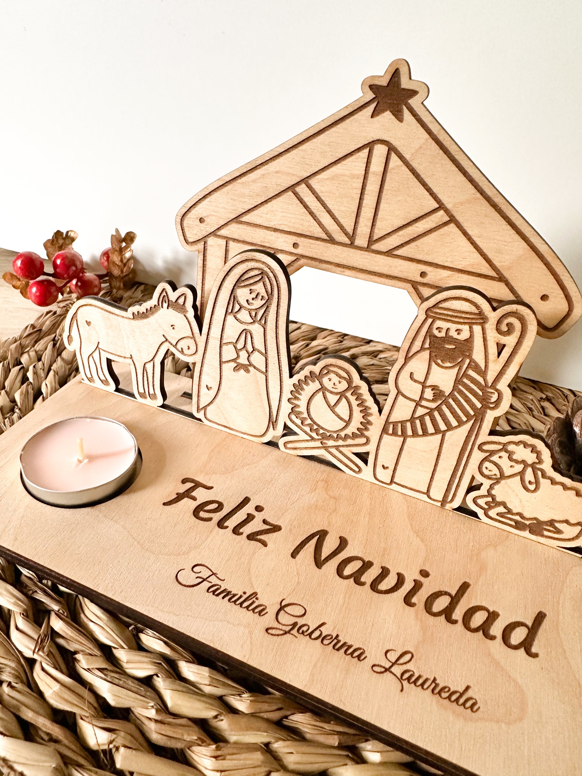 Decora tu hogar esta Navidad con este pesebre en madera de abedul, delicadamente grabado y preparado para convertirse en el detalle más acogedor de tus fiestas.