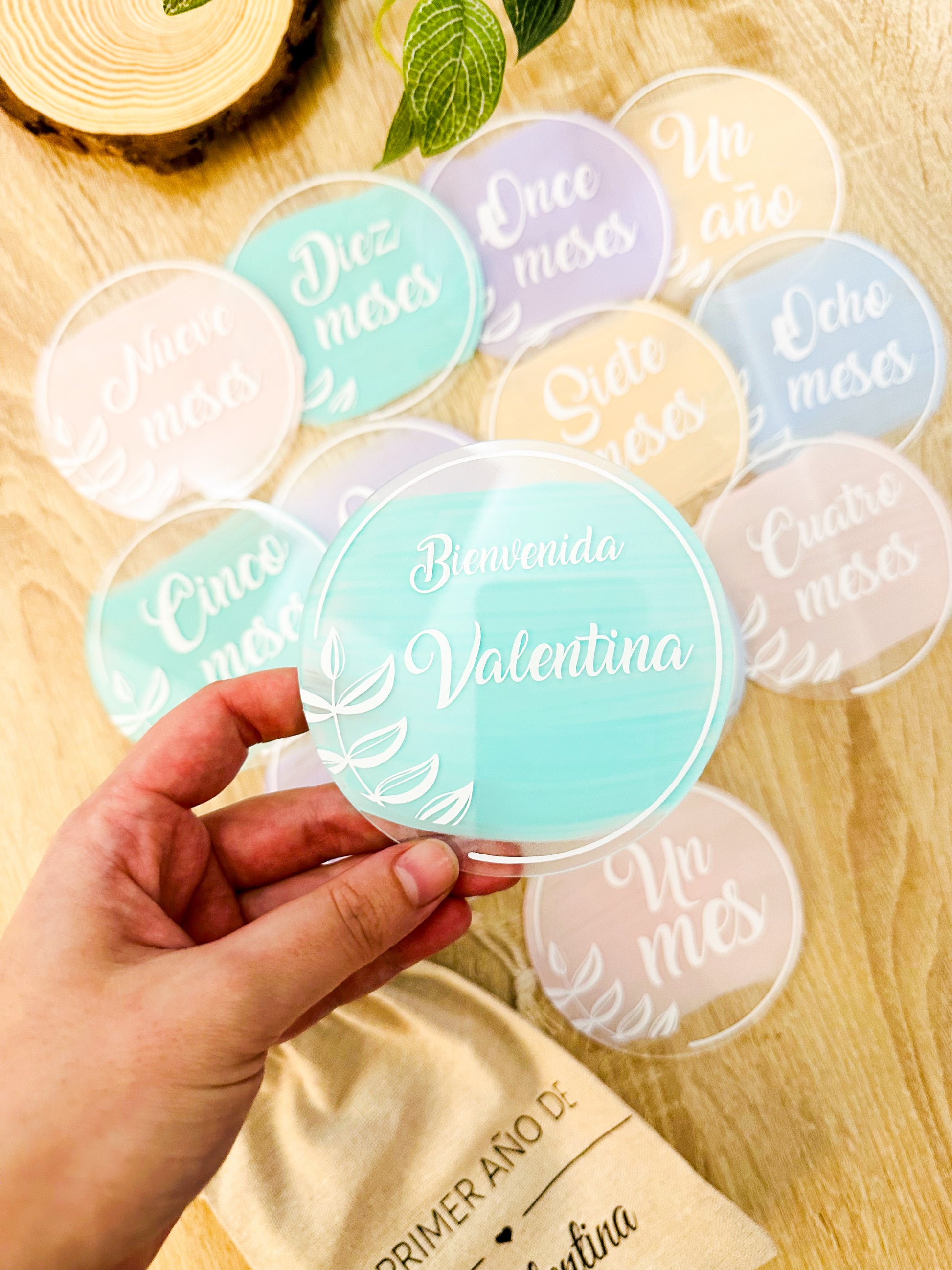 Pack de placas de acrílico para fotografiar mes a mes el primer año de tu bebé. Nuestros cumple meses son un regalo ideal de bienvenida para cualquier mamá